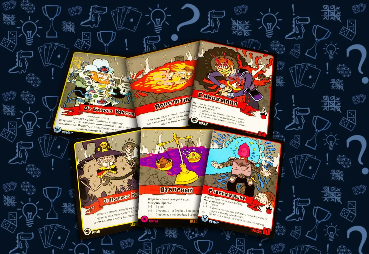 Сокровища. Сокровища — ядрёные предметы, которые прилетают вам от эффектов некоторых карт заклинаний. Получив сокровище, кладите его перед собой лицевой стороной вверх — его должен хорошо видеть каждый игрок. Сокровища никогда не берутся на руку. Кстати, будьте бдительны, некоторые завистливые колдуны могут отжать у вас «вашу прелесть». Некоторые карты сокровищ влияют на могучие броски: например, позволяют их перебрасывать. Эффект таких карт сокровищ, как «Золото дураков», применяется только после всех возможных перебросов могучего броска.